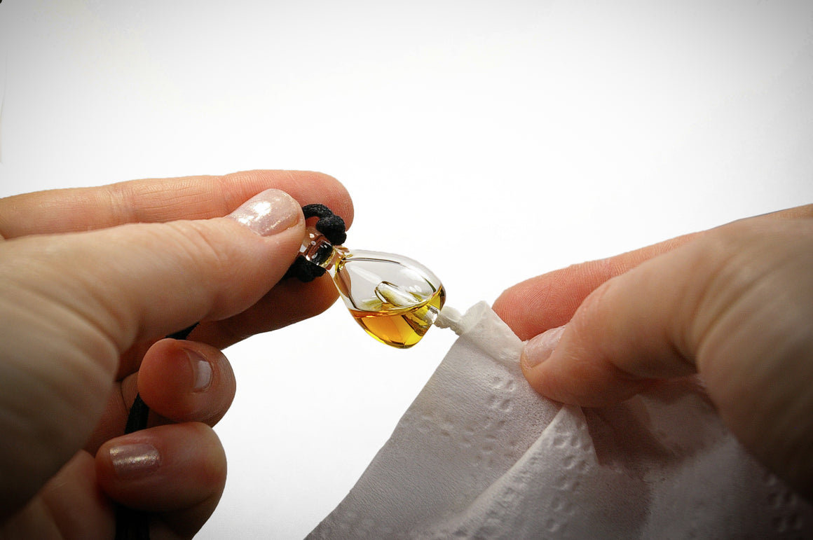 Once your pendant is filled, we suggest using a tissue to soak up any residual oil in the funnel. It is a small step that will help considerably if there is any concern about getting oil on clothing or your person.